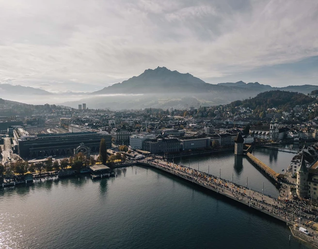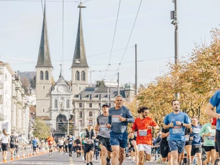 Les coureurs traversent l’embarcadère avec vue sur le Pont de la chapelle (Kapellbrücke) et la tour d’eau (Wasserturm). De l’autre côté du lac, le parcours passe devant le Palais de la culture et des congrès KKL, autour de la péninsule Horwer et le long du lac des Quatre-Cantons, avec une vue sur le panorama exceptionnel des montagnes de Suisse centrale. Dans le dernier tronçon, le parcours traverse le stade de football du FC Lucerne, le KKL et la pittoresque vieille ville de Lucerne.