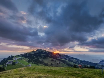 Après avoir gravi le sommet, une vue panoramique de 360° à couper le souffle vous attend. La combinaison de vues sur la chaîne alpine enneigée, la plaine avec ses 13 lacs, les vues sur l'Allemagne et la France et la perspective à vol d'oiseau sur les villes de Lucerne et de Zoug font de l'excursion au Rigi quelque chose d'unique. Le regard se déplace vers le nord en direction de Zurich, en passant par Ägeri, les lacs de Lauerz et de Zoug. Au nord-ouest, la vue s'étend du Plateau Suisse à la Forêt-Noire et aux Vosges. Le sud, avec la chaîne des Alpes recouverte de neige, est complètement différent et, à sa façon, époustouflant et fascinant. Lorsque la visibilité est optimale, on peut même voir 24 des 26 cantons suisses depuis Rigi Kulm. Il n'est donc pas étonnant que le Rigi soit aussi appelé la Reine des montagnes.