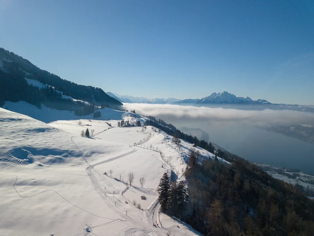 Des sentiers de promenade hivernale de rêve au pied du Rigi Kulm vous invitent à des balades, loin du stress et de l'agitation quotidienne. Des chalets chaleureux ornent le parcours bien balisé. L'auberge de montagne Räbalp, la Holderenhütte et le Grodstübli se distinguent par des spécialités locales et garantissent des endroits conviviaux pour se restaurer. Le point de départ et d'arrivée est la station supérieure du téléphérique Küssnacht-Seebodenalp ou le grand parking situé directement à la station supérieure.